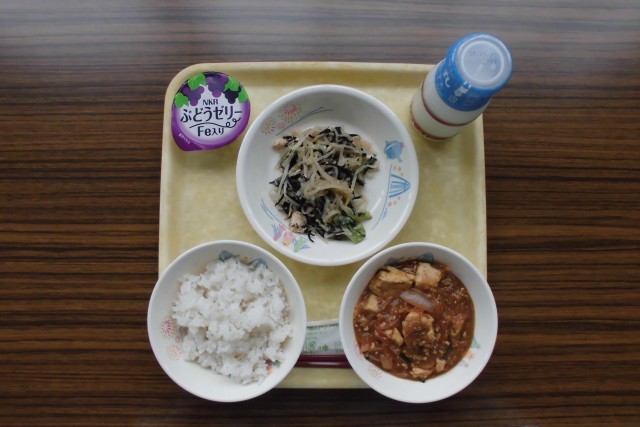 今日の献立は、牛乳、麦ご飯、ひじき入りバンバンジー、マーボードウフ、ぶどうゼリー です。