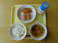 今日はパンの日です。パンは手で持って食べるので、しっかりと手を洗って食べましょう。洗い残しの多い部分として、手のひらのしわ、指先、手首、親指があります。手のひらは、手のひら同士を合わせこすり洗い、指先は、もう片方の手のひらに指先をこすりつけるように洗うときれいに洗うことができます。また、親指は親指だけをもう片方の手で握るように洗うとよいです。丁寧に手を洗って、きれいな手で給食を食べましょう。