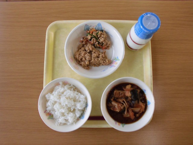 今日の献立は、牛乳、ご飯、3種のおさかなそぼろ丼(具)、彩り納豆、白菜のみそ汁 です。