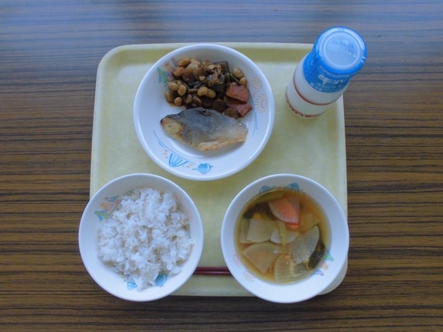 今日の献立は、牛乳、麦ご飯、ほっけの塩焼き、鉄火みそ、けんちん汁 です。