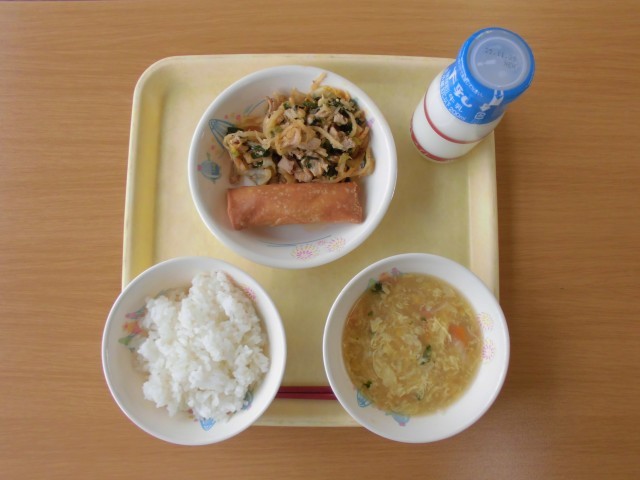 今日の献立は、牛乳、ご飯、愛知の野菜入り春巻き、切干しだいこんのキムチいため、うきうきエッグスープ です。