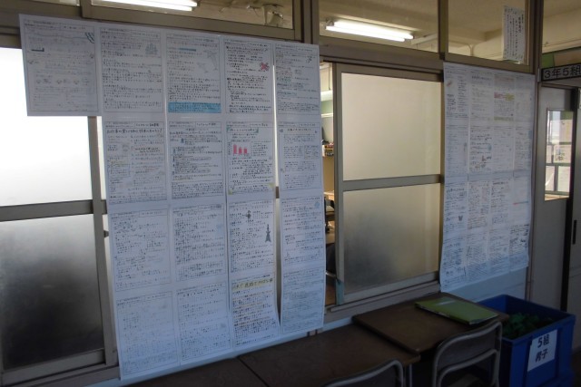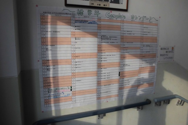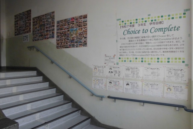 また、階段や廊下には生徒や職員が作成した、学年のカウントダウンカレンダー、行事写真、修学旅行で行ったキャリアインタビューのレポートなど、様々な掲示物があります。保護者会でご来校の際にご覧いただけたらと思います。