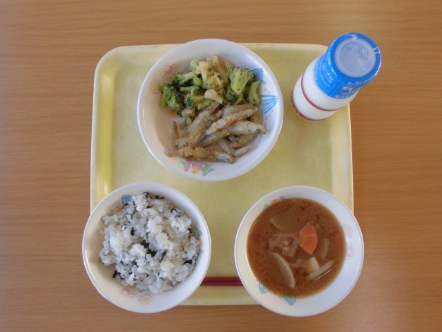 今日の献立は、牛乳、わかめご飯、わかさぎのから揚げ、花野菜のごま和え、冬の根菜豚汁 です。