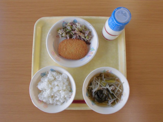 今日の献立は、牛乳、ご飯、コロッケ、赤じそ和え、沢煮わん です。