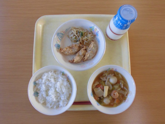 今日の献立は、牛乳、ご飯、揚げぎょうざ、中華和え、八宝菜 です。