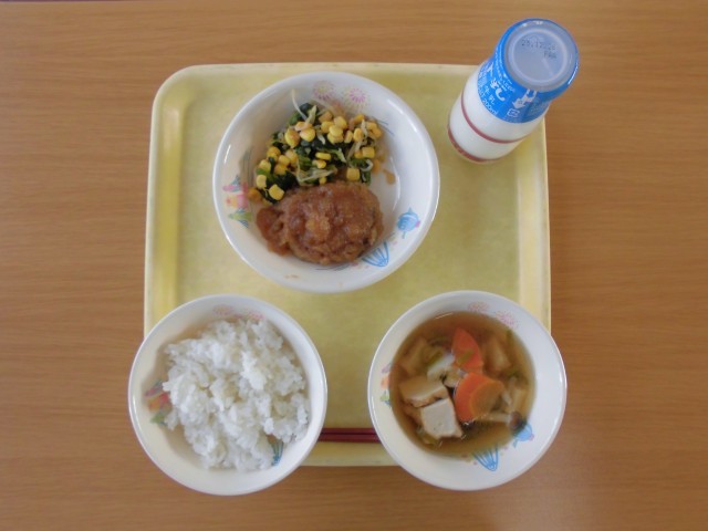 今日の献立は、牛乳、ご飯、おろしハンバーグ、黄金和え、吉野汁 です。