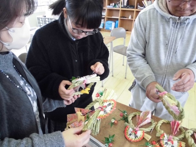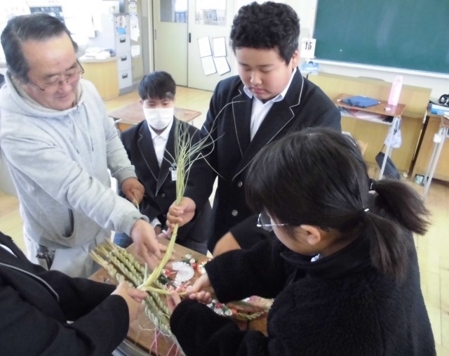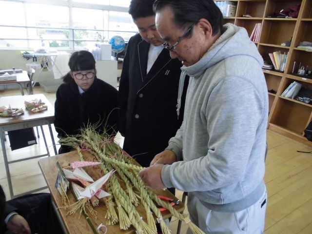 本日1時間目に、地域の方の力をお借りして、7組の生徒がお正月のしめ飾りを作成しました。みんなで協力して、上手に作ることができました。可愛い丙午(ひのえうま)のストラップが付いており、生徒も喜んでいました。