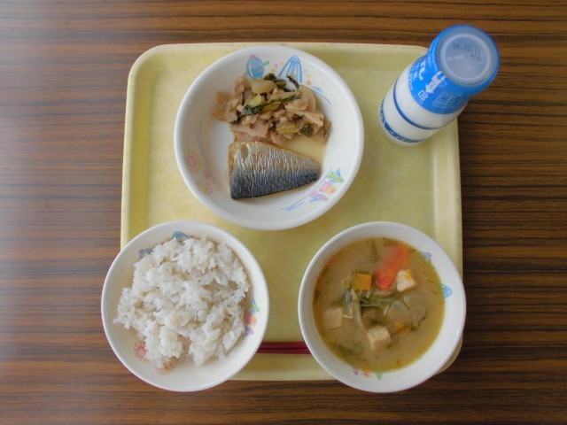 今日の献立は、牛乳、むぎごはん、さばの塩焼き、れんこんとかぶのいため物、根菜のかす汁 です。