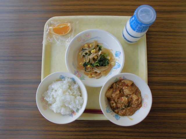 今日の献立は、牛乳、ごはん、ヘルシーマーボードウフ、バンサンスー、清見オレンジ です。