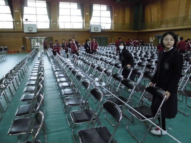 本日の朝礼の後に卒業生を送る会の招待状の贈呈式を行いました。その後、卒業生を送る会や卒業式に向けて体育館の椅子を並べました。本番まであと少しとなります。3年生の思い出に残る日になるよう準備をしていきましょう。