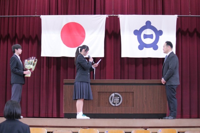 会の終わりには、3年生の代表生徒からお礼の言葉を伝え、花束を渡しました。
