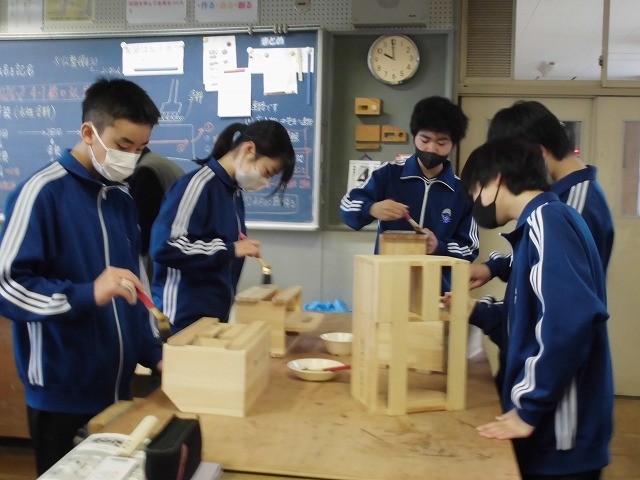 1枚目は1・2組男子の体育、2枚目は1・2組女子の体育、3枚目は3組の技術の授業の様子です。技術の木工製作では、仕上げのニス塗りをしています。17日18日に最後の技術の授業があり、作品を持ち帰る予定です。
