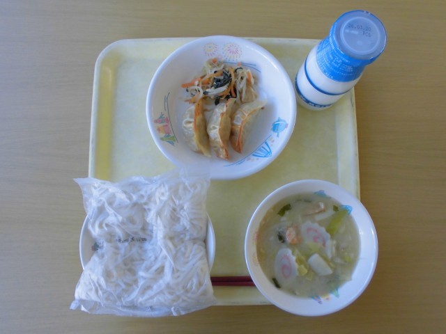 今日の献立は、牛乳、ソフトめん、焼きぎょうざ、カラフルナムル、海鮮ちゃんぽん(汁)です。
