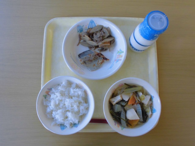 今日の献立は、牛乳、ご飯、たらのかす漬け、牛肉とごぼうのいため煮、いものこ汁 です。