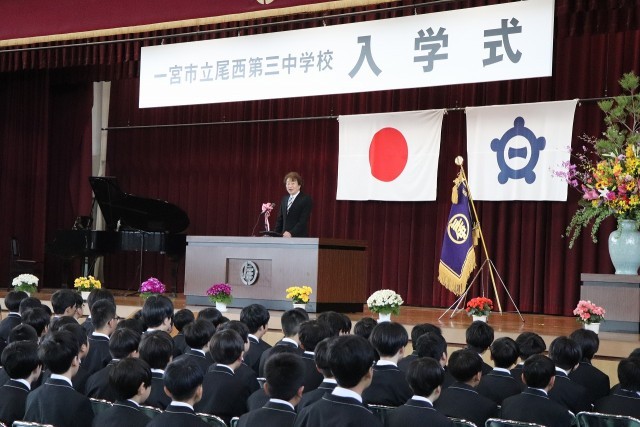 新入生のみなさん、あらためて尾西第三中学校への入学、おめでとうございます。中学校生活への不安や緊張もあると思いますが、新しい出会いに期待や楽しみもあると思います。緑学年163名の仲間とともに、充実した中学校生活を送ってほしいと思います。