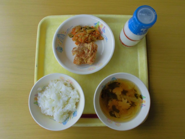 今日の献立は、牛乳、ご飯、鶏肉のから揚げ、じゃがいものきんぴら、さくらのすまし汁 です。