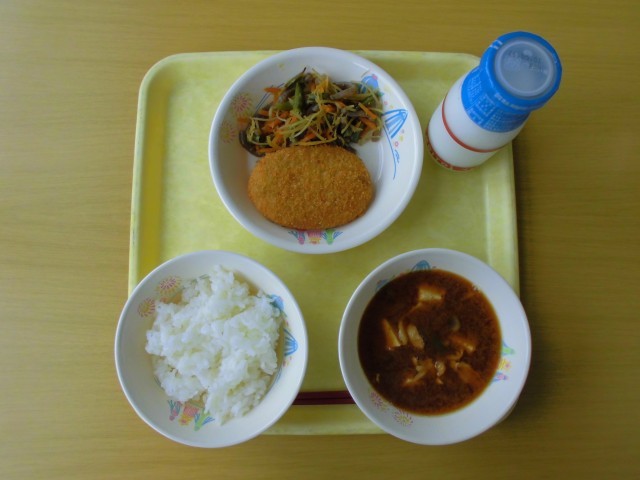 今日の献立は、牛乳、ご飯、コロッケ、千切りごぼうの甘辛煮、豚汁 です。