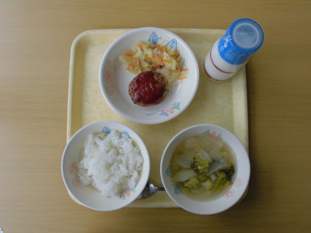 今日の献立は、牛乳、ご飯、ハンバーグのケチャップソース、キャベツソテー、ABCマカロニスープ です。