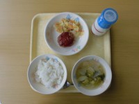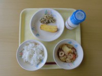 今日の献立は、牛乳、ご飯、さばの塩焼き、五目煮豆、若竹汁 です。