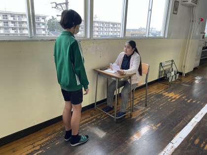 10.29 インタビューテスト(2年生) 公開日 2024/10/29 更新日 2024/10/29 2年 2年生の英語の授業ではALTの先生とインタビューテストを行いました。先生から質問されたことに答えるという内容で実施しました。緊張しながらも上手に受け答えすることができていました。