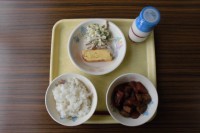 今日の献立は、牛乳、スライスパン、オムレツのトマトソースかけ、かぼちゃの豆乳シチュー、メープルジャム です。