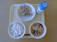 今日の献立は、牛乳、ご飯、生揚げの肉みそかけ、なのはな和え、のっぺい汁 です。