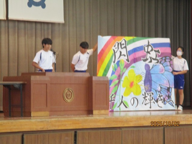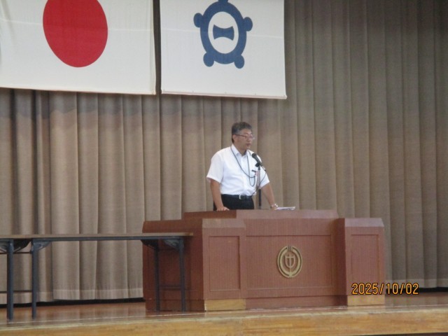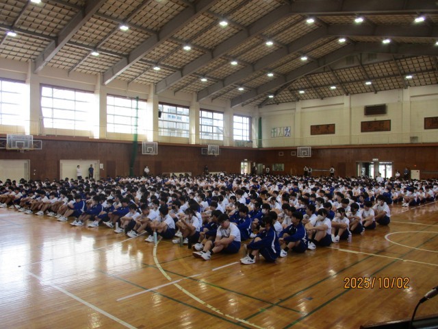 10月2日(木)学校の様子『全校集会』 公開日 2025/10/02 更新日 2025/10/02 学校の様子 昨日、10月に入りました。今日は月始めの全校集会を行いました。内容は表彰伝達、教頭先生のお話、体育祭スローガンの発表でした。暑さもずいぶん和らいできたので久しぶりに体育館で集会を行いましたが、相変わらず無言入場や聞く姿勢ができており、「千人力」を感じることができました。