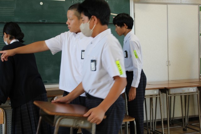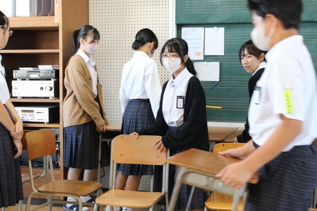 来週から始まる学級での合唱練習にむけて、2年生が音楽室の準備を行いました。声をかけあいながら机や椅子を並べ、協力して取り組みました。
