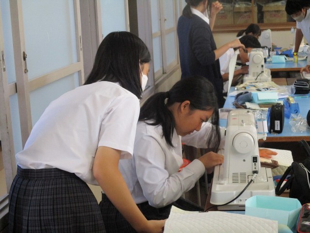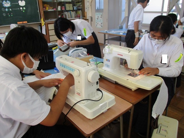 2年生は、家庭科でキルトのかばん作りをしています。いざ、ミシン。小学校で学習したことを思い出して作業していきます。針や糸のセットの仕方はどうだったかな?友だちと教え合いながら、頑張ります。集中して取り組む姿が素敵です。