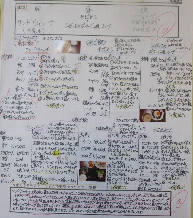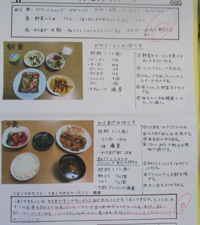 家庭科で取り組んだ「シェフ体験レポート」を紹介します。栄養のバランスを考慮して思い思いの料理を作り、料理の写真やレシピ、感想や反省点などを丁寧にまとめたレポートが提出されました。工夫を凝らして作った料理は、家族みんなを笑顔にしたようでした。