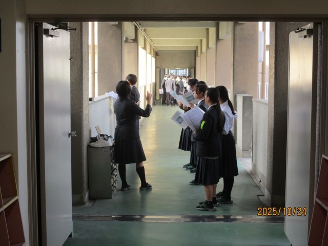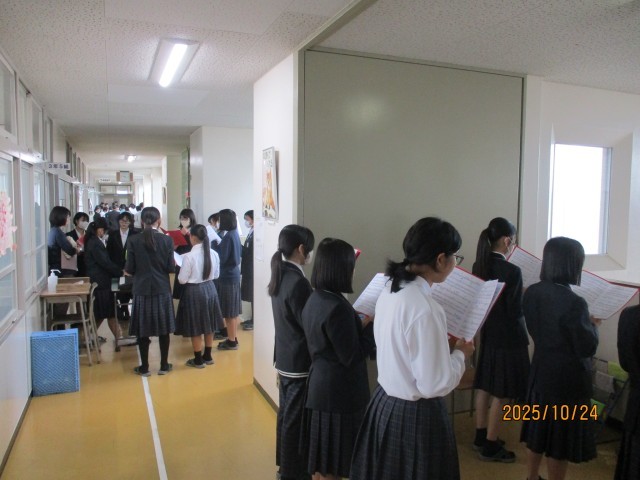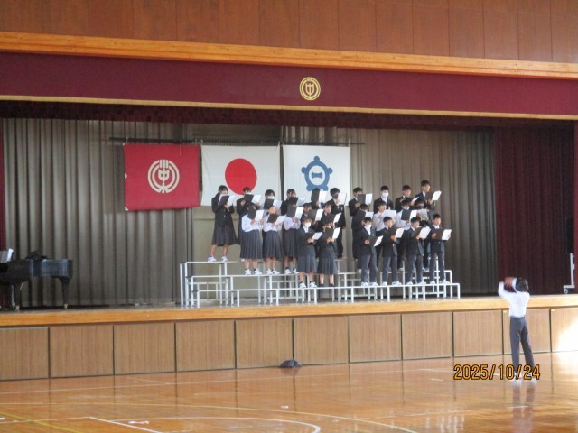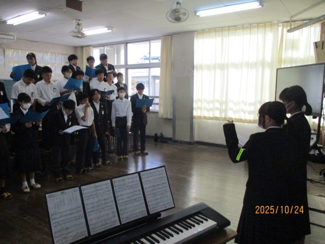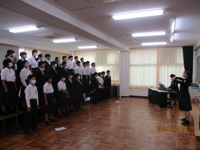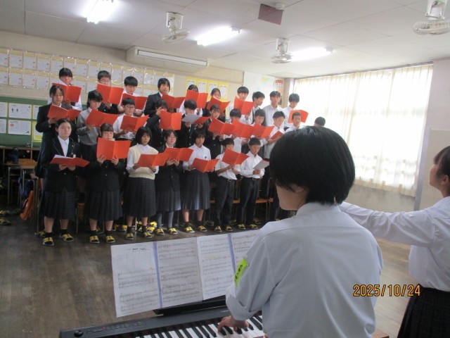 10月24日(金)学校の様子『合唱コンクール練習4日目』 公開日 2025/10/24 更新日 2025/10/24 学校の様子 今日は合唱練習4日目です。先生からではなく生徒からの指示やアドバイスが増えてきました。合唱を自分たちの手でつくりあげる、そんな思いが伝わってきました。また、教育実習生が合唱指導をする場面もありました。頼もしく感じます。来週も合唱練習は続きます。体調を整えながら、がんばっていきましょう。 +5