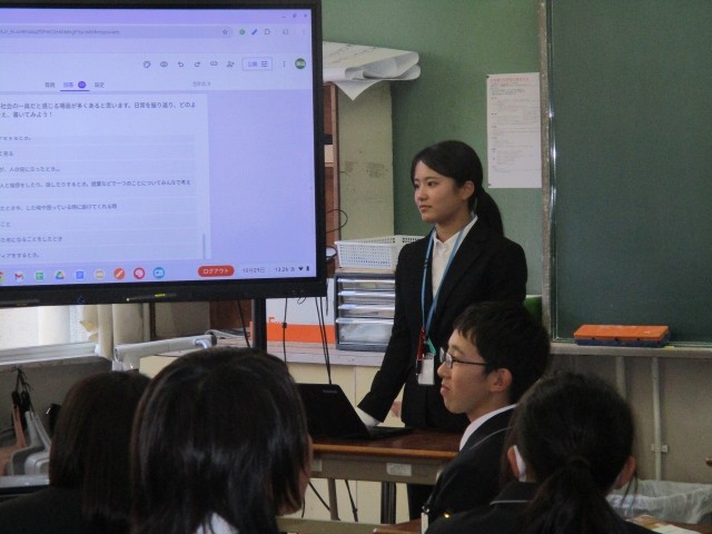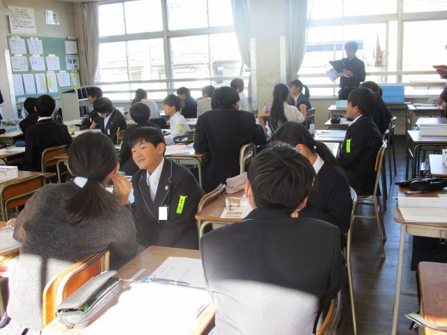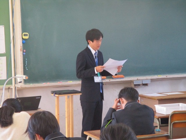 1年生の学級で、2名の教育実習生が道徳の研究授業を行いました。実習生にとって、中学校での記念すべき人生初めての授業となります。実習生の発問に対し、生徒たちは真剣に考え、発言していました。