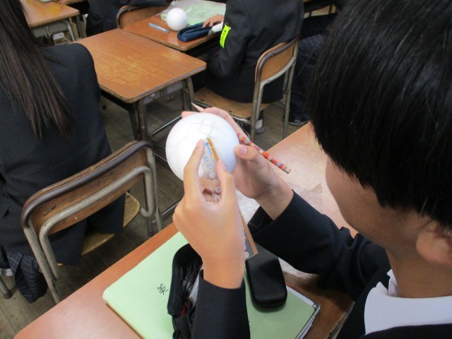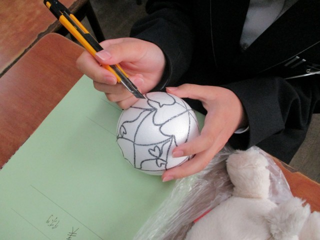 2年生の美術の授業では、木目込みという人形づくりに使われる技法を使って、まりの装飾をつくっています。今日はまりにデザインを写し、切込みを入れている所です。次は布を張るところに入ります。きれいな色合いのまりが完成するのを楽しみにしています。