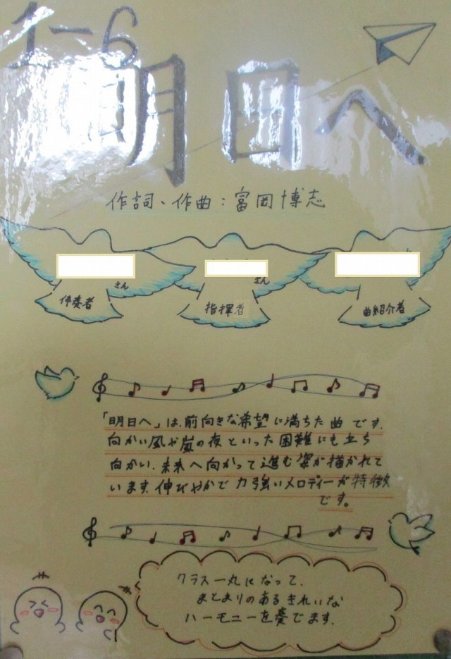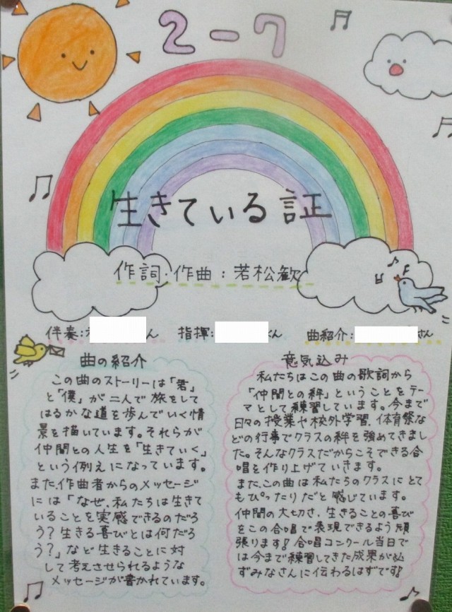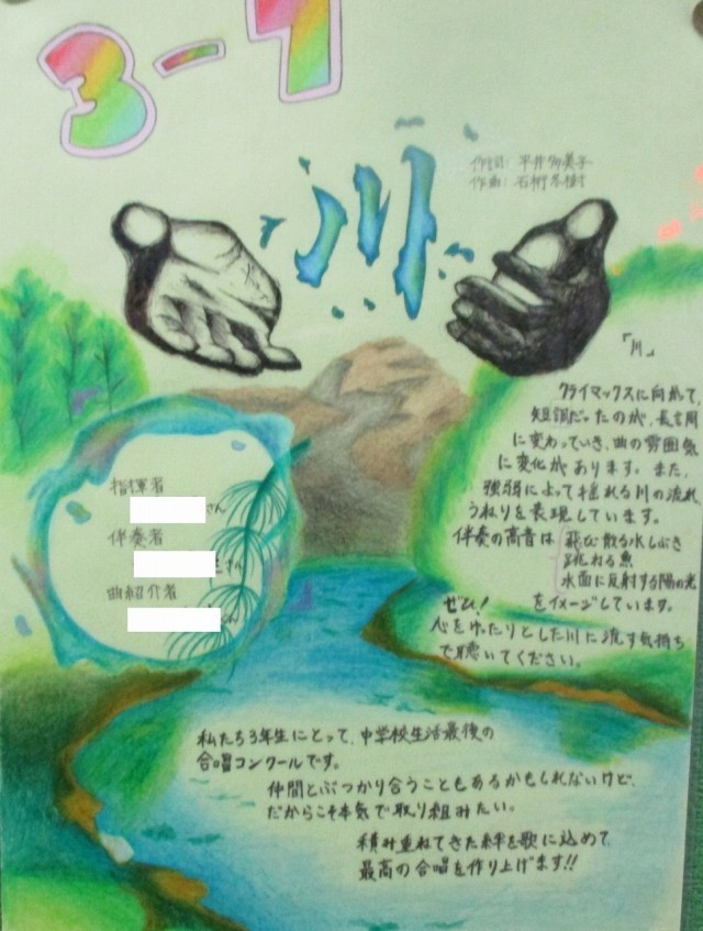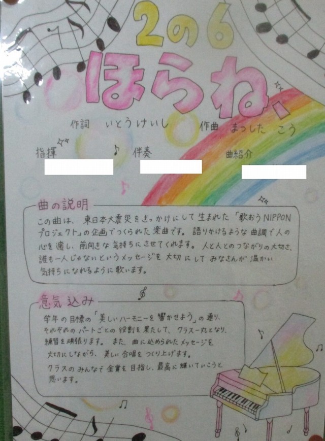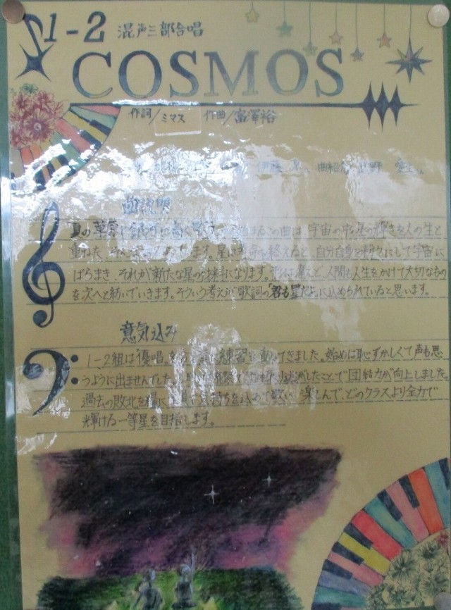 合唱コンクールまで約1週間、各学級での練習も盛んに行われています。職員室前廊下に掲示されている「合唱コンクール 学級ポスター」を紹介します。これは、各学級が合唱に込める思いやイメージを表現したもので、意気込みなども書かれています。