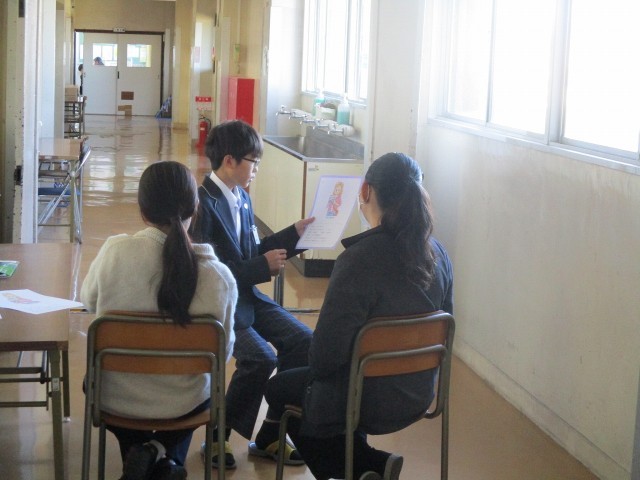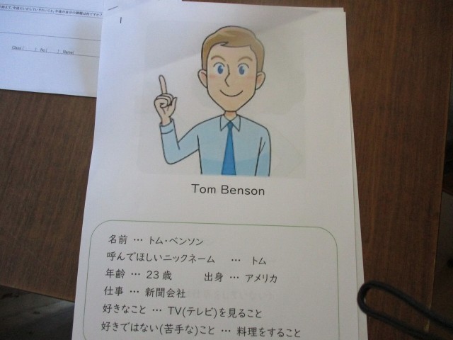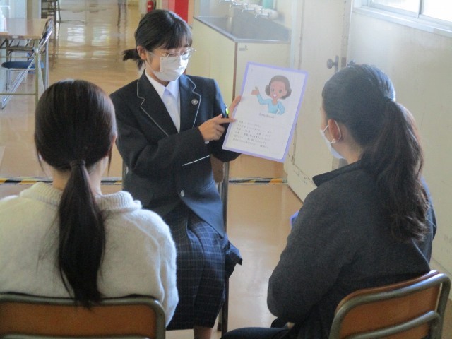 1年生英語の授業では、ALTと教科担任へ英語で人物紹介をするテストを行っていました。氏名、年齢、職業、好きなことなどが日本語で書かれたボードを持ちながら、英語で説明をします。授業で学習したことを生かして、英語で有名人やキャラクターなどを紹介する練習をしていくといいね。これからも楽しみながら英語学習を進めていきましょう!