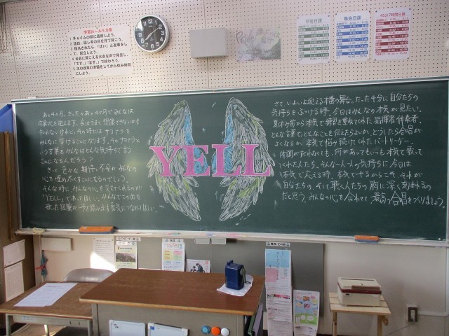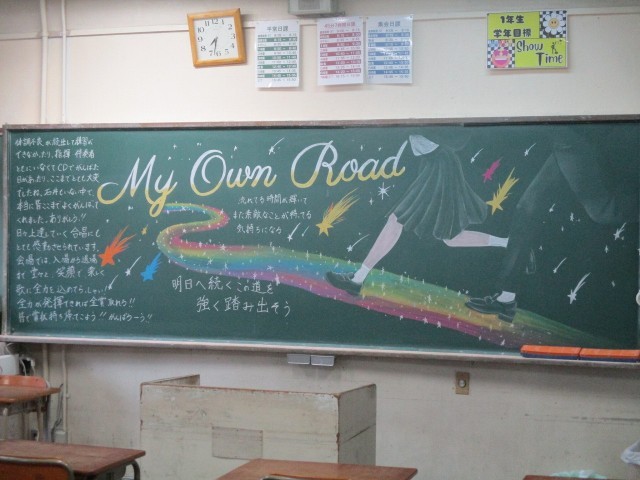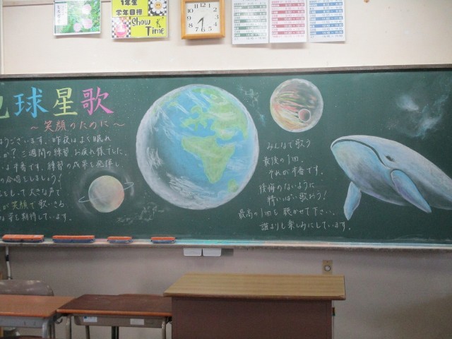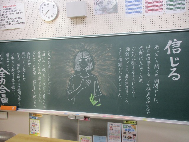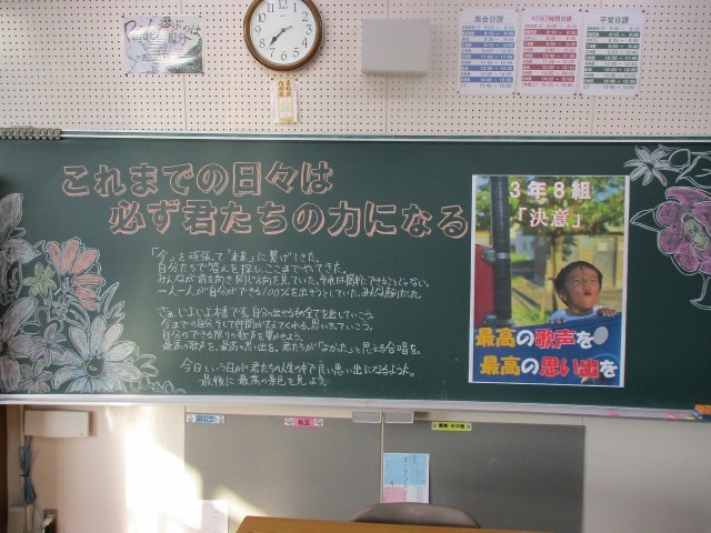 各教室では担任からの励ましの板書。「最高の歌を届けたい」「仲間を信じて歌いきりたい」という想いが込められた素敵な黒板アートでした。いよいよ本番です。これまでの練習の成果を信じて、全力で歌い上げます。