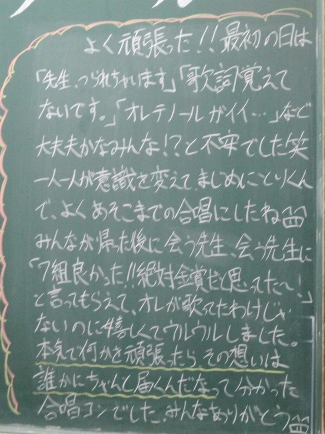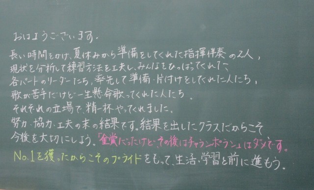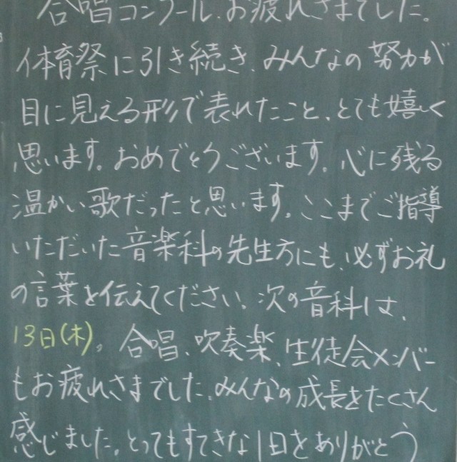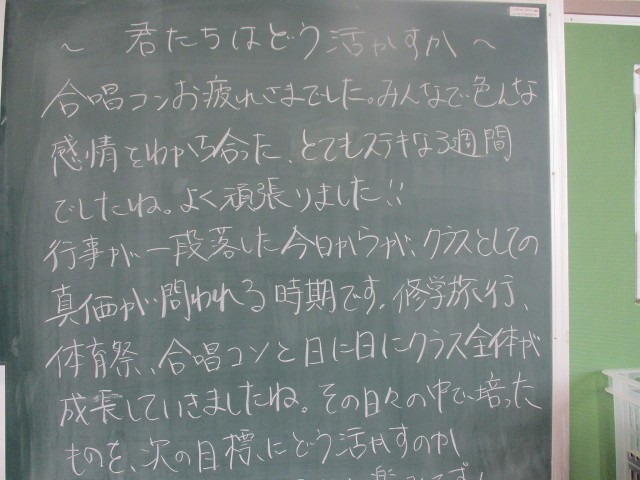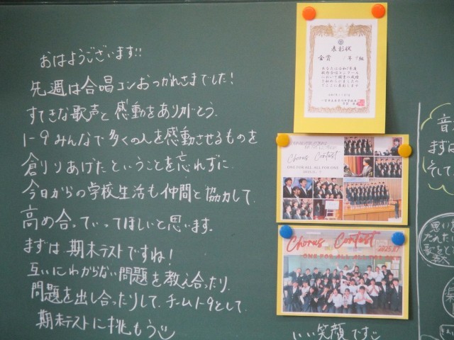 合唱コンクルールで、クラスのスローガンをもとに団結したクラスも多かったと思います。 これらのことが、先週の感動的な合唱につながったのでしょう。この団結力、集中力を週末からの期末テストに向けていきましょう。