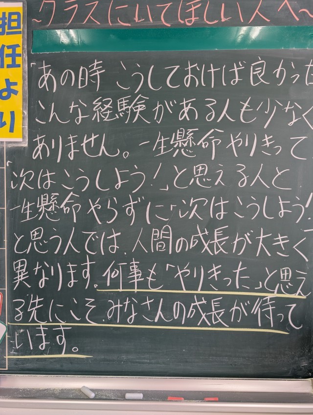 全力を尽くしたという満足感をもってテストに臨んで欲しいと思います。