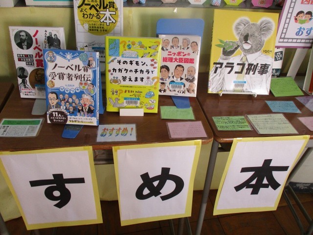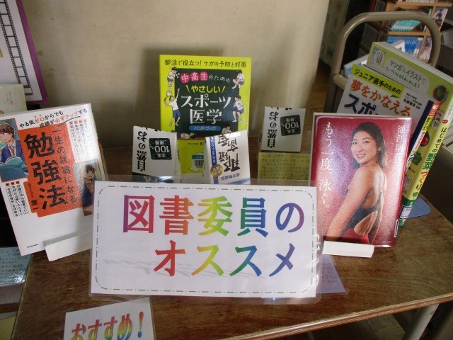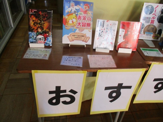 図書館をのぞいてみると、図書委員さん、図書館司書さんのおすすめの本、新刊がたくさん並んでいました。本を読むことで「志」が自分の中に芽生えていきます。「志」とは、自分はどんな人になりたいか、どんな人として一生を送りたいかということです。そこにはゴールがないし、成功失敗もない。自分が人生を終える瞬間まで続いていくのが「志」です。自分の中に「志」が芽生えるような読書をしてほしいと願っています。