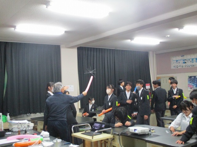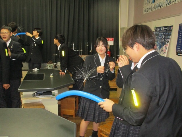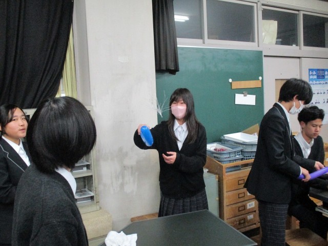 理科室から大きな歓声が聞こえてきました。様子を見ると、棒状の風船と荷造り用のひもを使って、実験をしていました。名付けて「空飛ぶ電気クラゲ」理科の面白さ、醍醐味ですね。