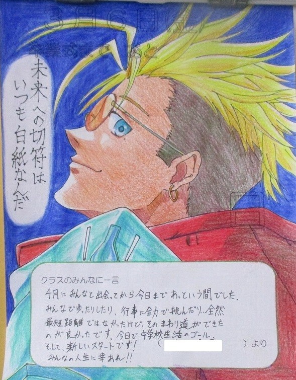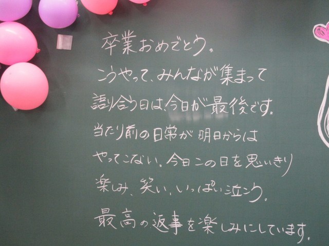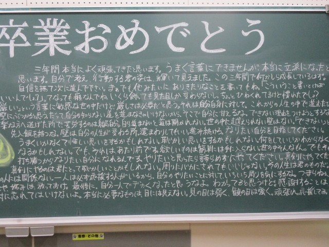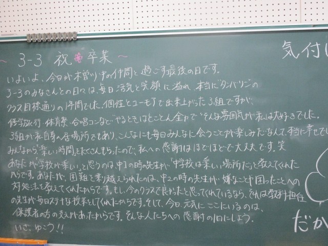 卒業式当日、3年職員からのメッセージです。生徒の皆さんへのあふれる想いが伝わってきます。このメッセージに応え、式では最高の姿を見せてくれました。ありがとう。