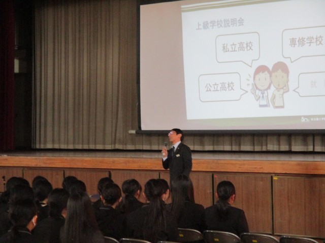 昨日、2年生生徒、1・2年生保護者を対象に上級学校説明会を行いました。人生も受験勉強も選択の連続です。「合格するかしないか」は自分では選べるものではありません。しかし、「どう勉強するか」「どの学校を受けるか」等は自分で選べるものです。選択権はあなた本人にあります。誰かに選んでもらっても、その結果は結局あなたに返ってきます。主役はあなたです。後悔しないよう、いろんな人と相談しながら、今後しっかりと進路を考えていきましょう。