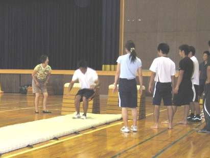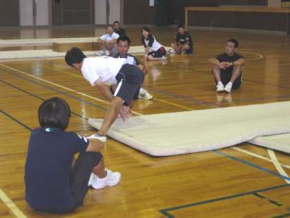 午前中は、講義に続き、体つくり運動・マット運動の実技講習がありました。午後には、跳び箱運動の実技講習を行った後、グループごとに互いに教師・生徒役となって模擬授業を行う、といった形式の講習が行われました。器械運動が苦手な子でも段階を踏んでできるようにする指導法などがよくわかる講習内容で、受講生も真剣に取り組んでいました。