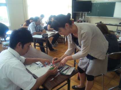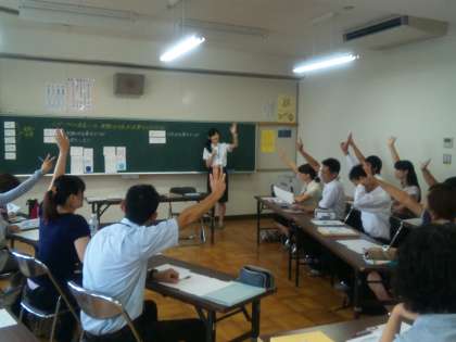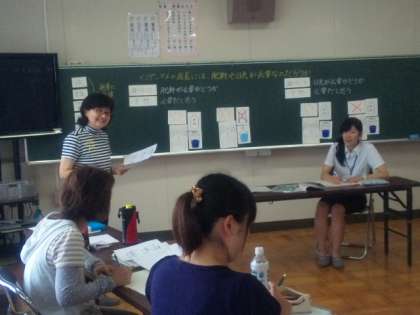 小学校若手教員を対象にした「元気が出るステップアップ講座」の夏季休業中の研修テーマは、授業力の向上です。受講者が互いに児童役になり、4回の模擬授業をて行いました。児童を演じることによって、どのような問いかけや指示が、子どもにとって分かりやすいものであるかを体感しました。そして、そうした視点から授業の良かった点や改善すべき点を協議しました。2学期からの授業に結びつくようにと、講師の佐藤明代先生の指導にも熱が入りました。