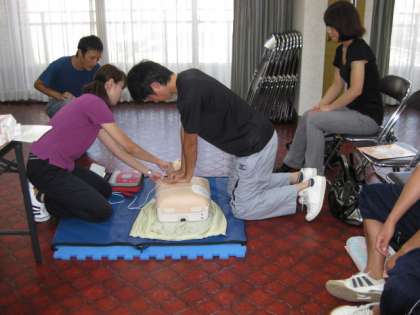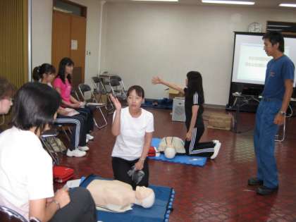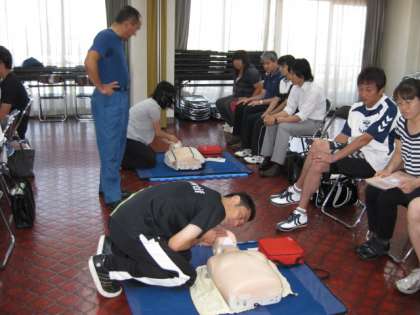H22.8.18(水)普通救命講習会 公開日 2010/08/20 更新日 2010/08/19 研修会 一宮市小中学校教職員対象の普通救命講習会を木曽川庁舎で行いました。一宮市では小中学校の全教職員が受講することを目標に、毎年夏休みと冬休みに、1回3時間の普通救命講習会を開催しています。 児童生徒の「万が一」の場合に備え、受講者は真剣な面持ちで消防署員の指導を受けていました。