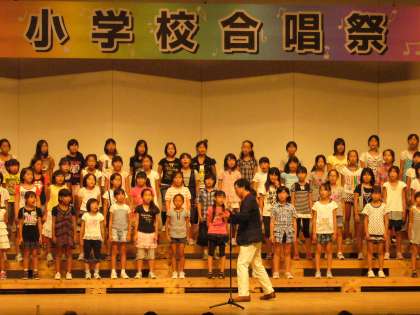 午前・午後の部の最後には、市のシンボルソング「人・街・未来へ」を作曲され、本合唱祭を指導していただいている新実徳英先生の指揮に合わせ、参加者全員で「人・街・未来へ」を合唱しました。子どもたちの思いは聴く人の心を捉え、アンケートに「感動しました。」と言った感想をたくさんいただきました。歌い終わった子どもたちの顔も充実感にあふれ、合唱によって生まれる楽しさや喜びを実感していました。