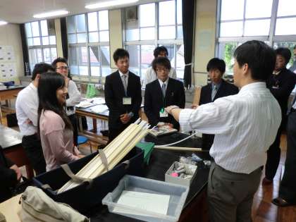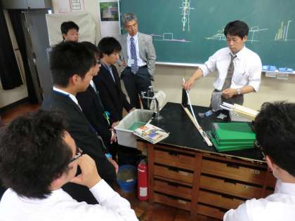 一宮市立北部中学校にて、中学校3年生を担当している教員を対象に理科実践講座が開催されました。研修内容は、新学習指導要領で追加される内容のよりよい指導法について話し合い、新しい実験教具を活用しての実技講習等です。また、情報交換の中では、受講者が学校で活用していた重要用語集や学習プリント等を持ちより、交換しあいました。