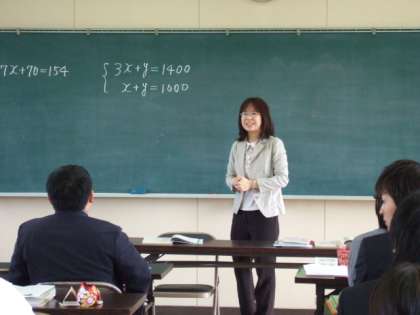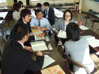 5月24日(火)第2回数学教育実践講座 公開日 2011/05/25 更新日 2011/05/25 研修会 雨上がりのさわやかな午後、若手数学教員を対象にした第2回数学教育実践講座を開催しました。今回は、連立方程式の指導法と、これから指導する内容を学年別で検討して研修を深めました。講師の先生の熟練の授業の指導法を学びとろうとする先生方の、真剣で熱いまなざしを見て、きっと明日からの授業で生かしてくれるとだろうと確信しました。