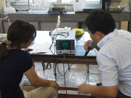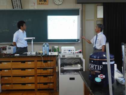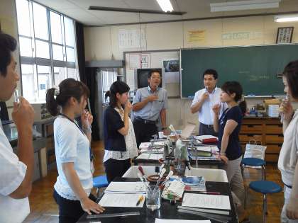 第1部では、中学1年生「音の性質」の単元で、身近にあるストローや試験管等使って楽器作りを行いました。第2部ではオシロスコープを使って音の波形を観察したり、音速測定タイマーを使って音速を測定したりしました。受講者からは、「自校の生徒にも、身近な物理現象の面白さや・不思議さを体感させたい」という意見が聞かれました。その後、各自が持参したテスト問題について、「問題作成の意図」や「テスト処理」について意見交換を行いました。
