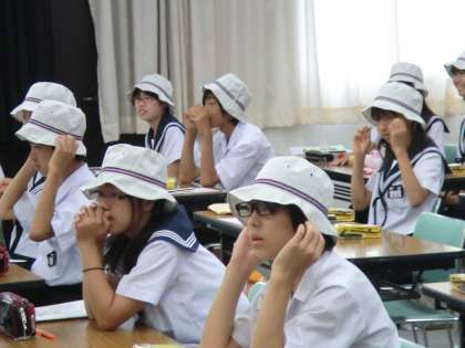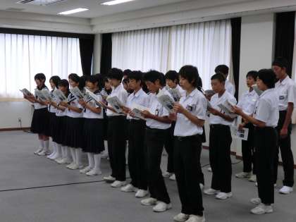 8月6日(土)に出発する「平成23年度 一宮市中学生海外派遣(訪問国:中国)」では、8月8日(月)に北京第二十五中学(北京)・8月11日(木)に趙長軍武術学院(西安)・8月12日(金)に沙田中学校(上海)を訪問します。訪問中学校で交歓会を開催し、日本と中国の歴史や文化、生活習慣の違い等を伝え合います。本日は派遣生徒に、派遣期間中に使用する物品(ショルダーバックや帽子等)が配付されました。その後、交歓会で発表する合唱の練習やスタンツについて班ごとに分かれて話し合いました。